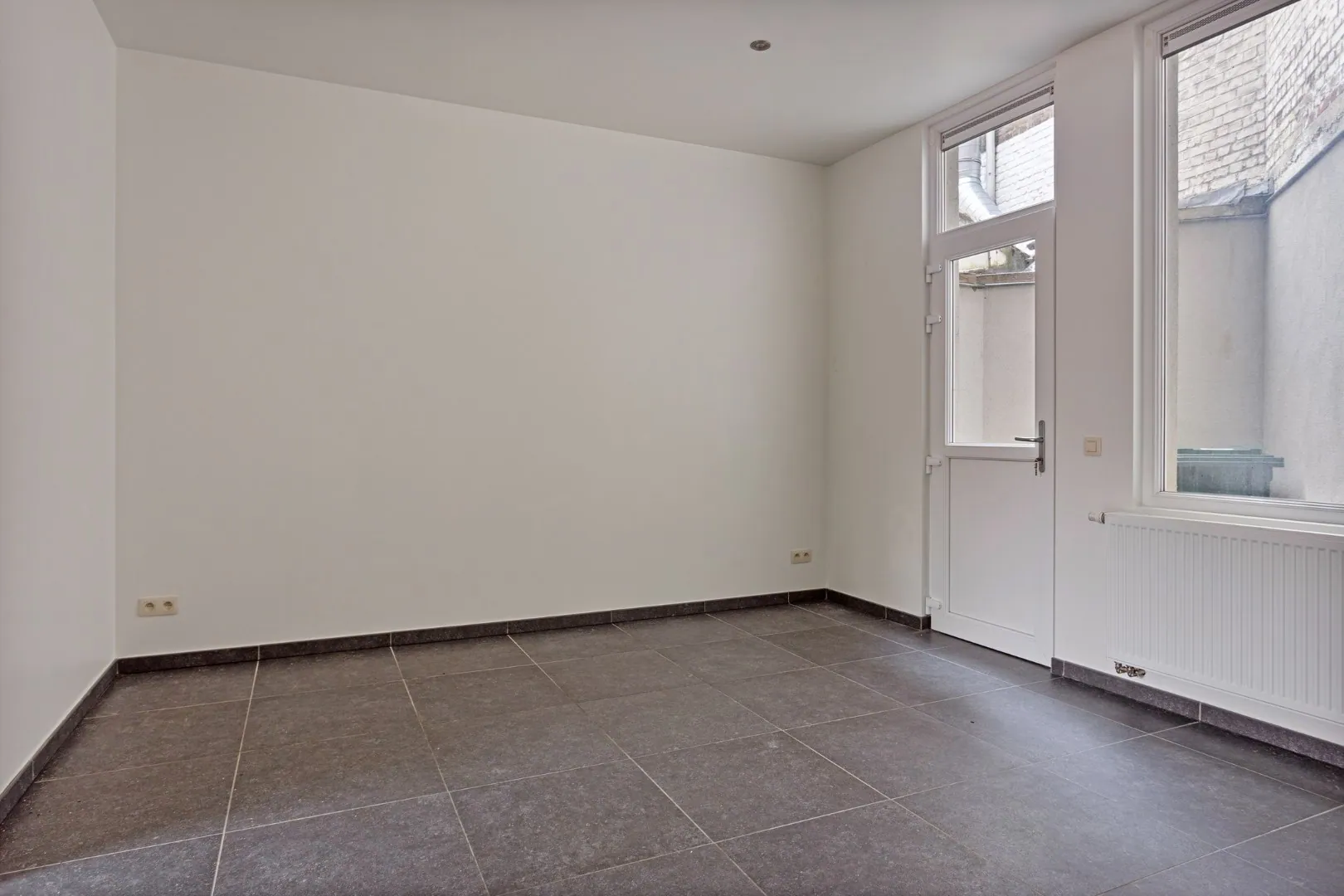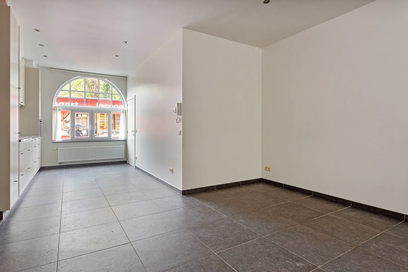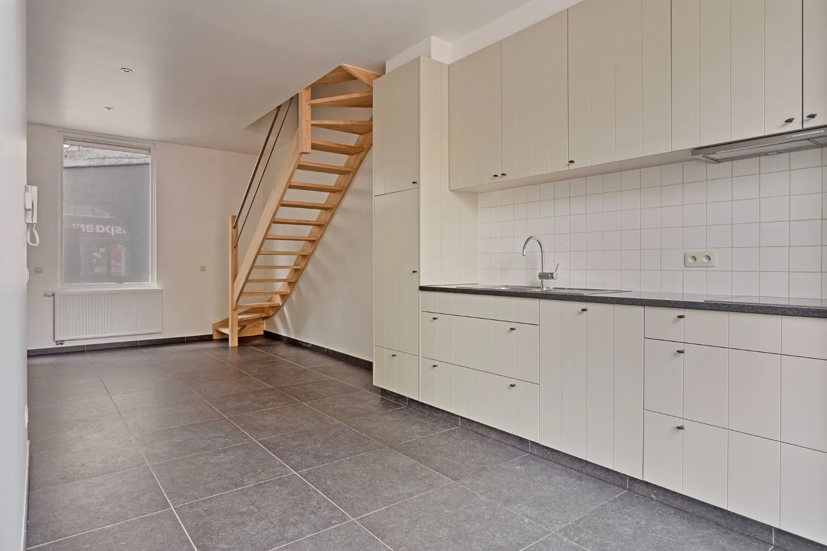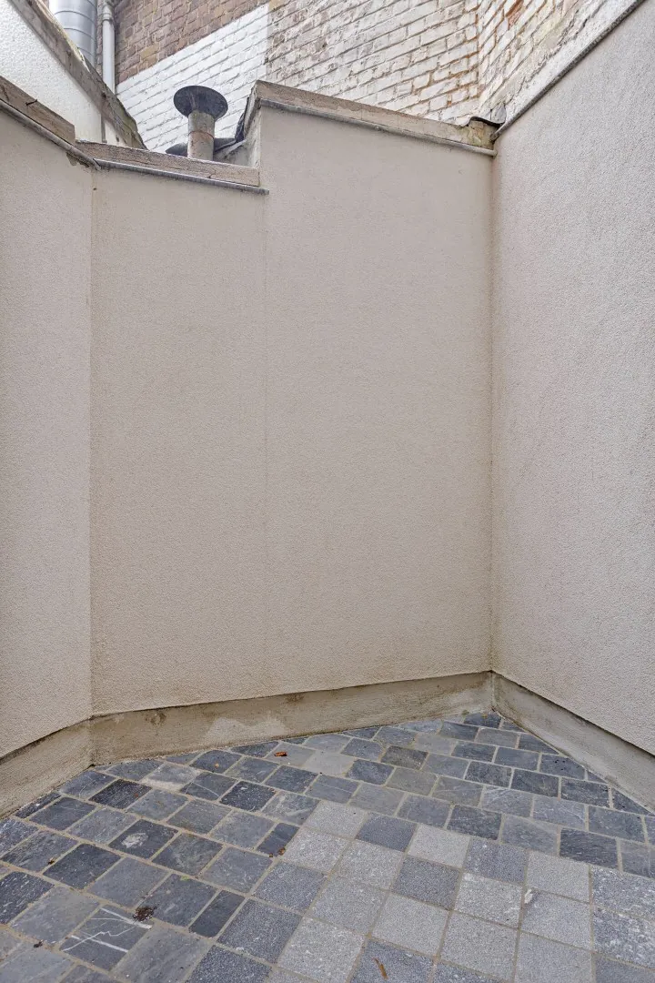 Je komt binnen op het gelijkvloers waar je een keuken, woonkamer en een aangrenzend terras vindt.