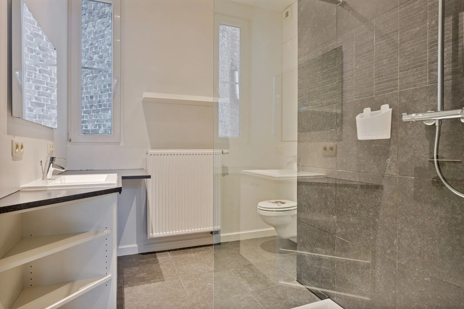 Op de eerste verdieping vind je de 2 slaapkamers en een badkamer met wastafel, inloopdouche en een toilet.