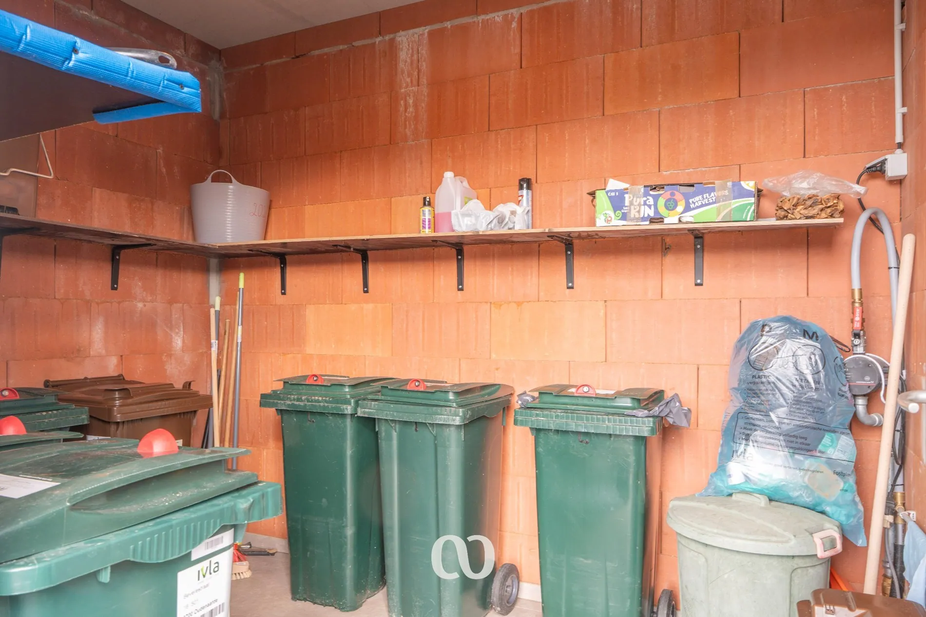 Op het gelijkvloers vind je een privatieve berging en de toegang tot de parking, waar één vaste parkeerplaats inbegrepen is bij het appartement. Aansluitend aan de parking is er bovendien een gemeenschappelijke berging voor vuilnisbakken, wat bijdraagt aan extra gebruiksgemak.
