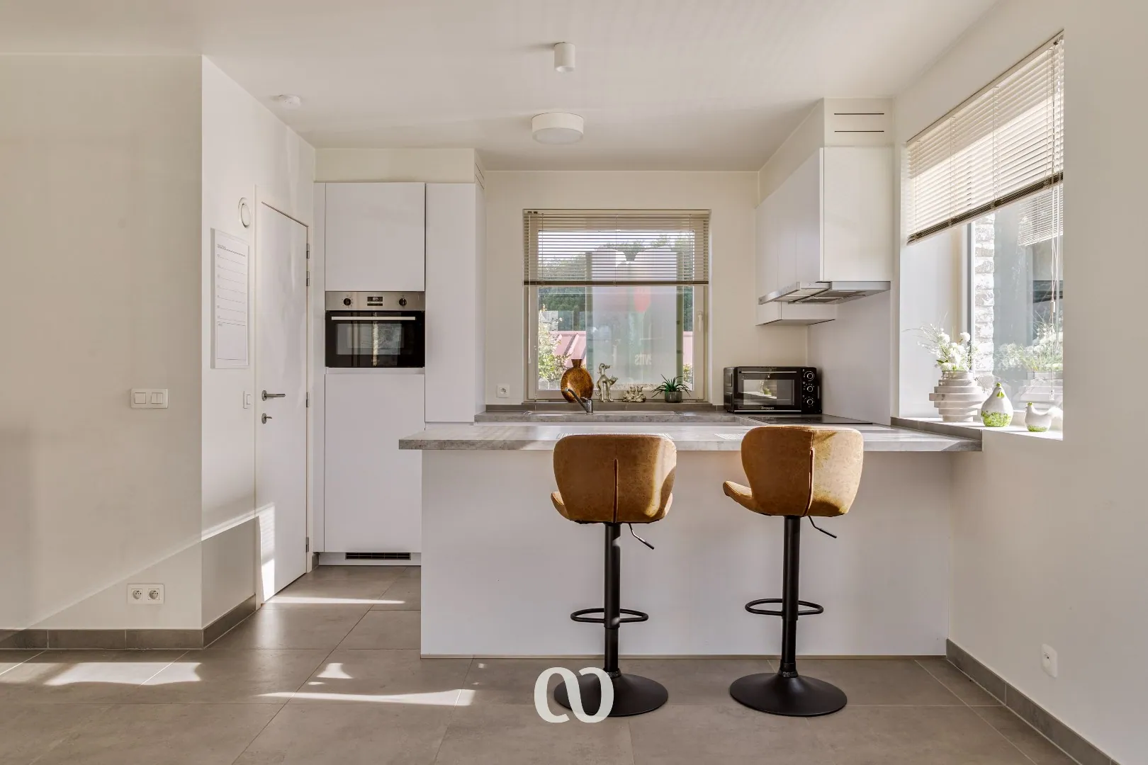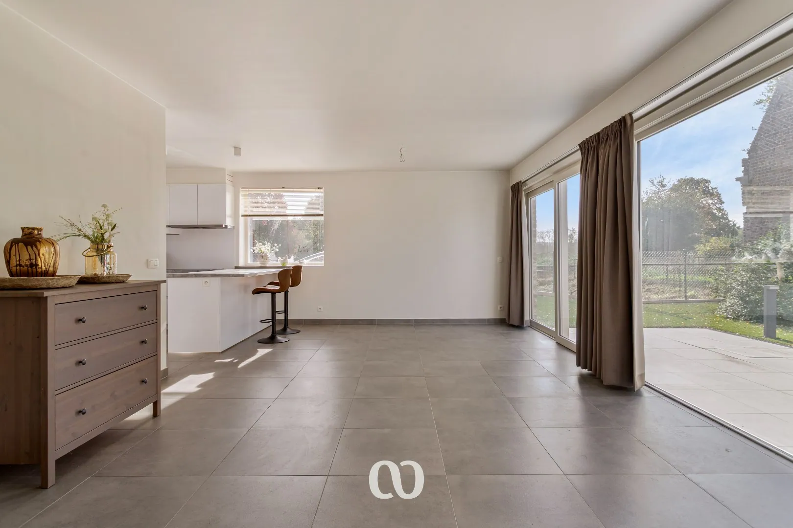 Je komt de woning binnen via de ruime inkomhal met gastentoilet. Wanneer je doorloopt naar de living, wordt je overladen door natuurlijk licht vanwege de grote raampartijen. De living loopt over in de open keuken, en naast de keuken bevindt er zich een handige berging.