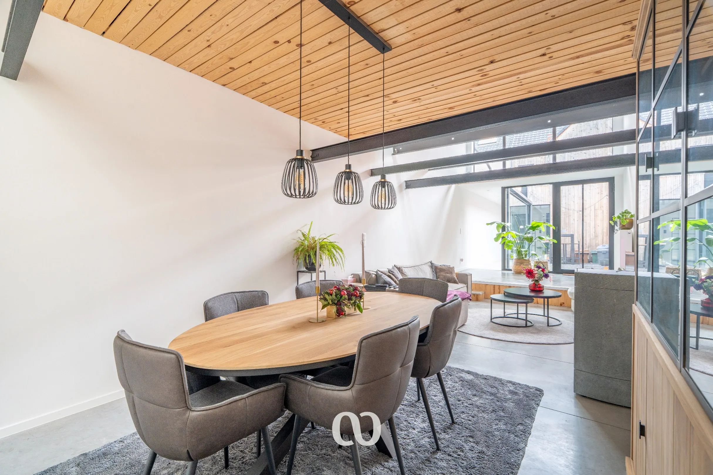Boven de leefruimte bevindt zich een stijlvolle mezzanine. Deze extra ruimte kan perfect ingericht worden als slaapkamer of bureau, wat zorgt voor een speels en open gevoel in huis.