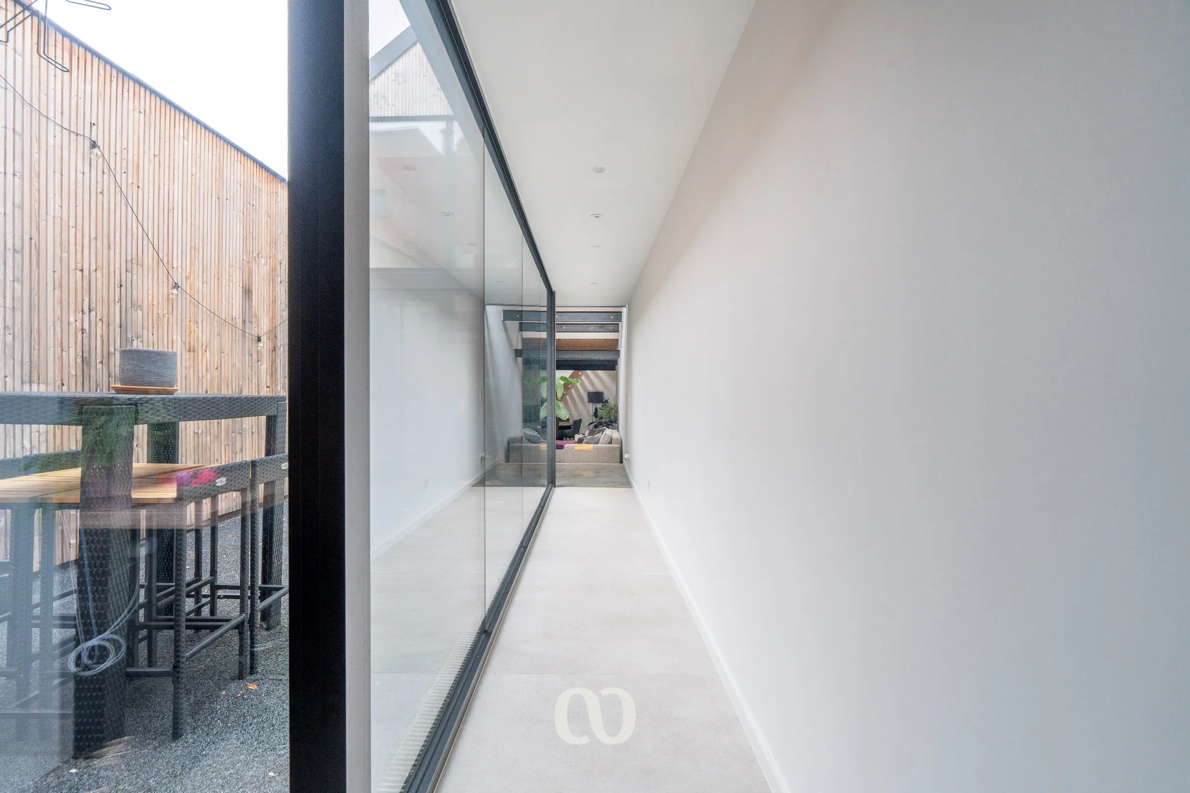 De keuken en leefruimte worden op een unieke manier verbonden door een charmante binnentuin. Deze buitenruimte biedt de perfecte plek om een gezellig terras te creëren, een intieme setting om te genieten van lange zomeravonden of een rustige ochtendkoffie.