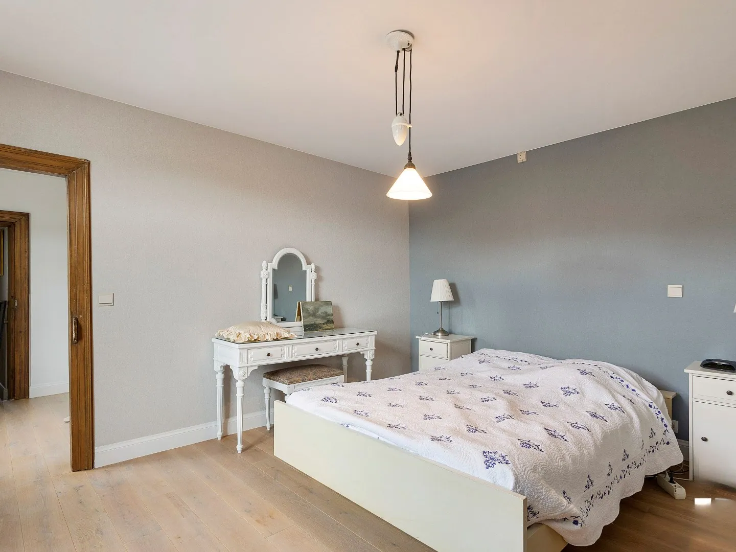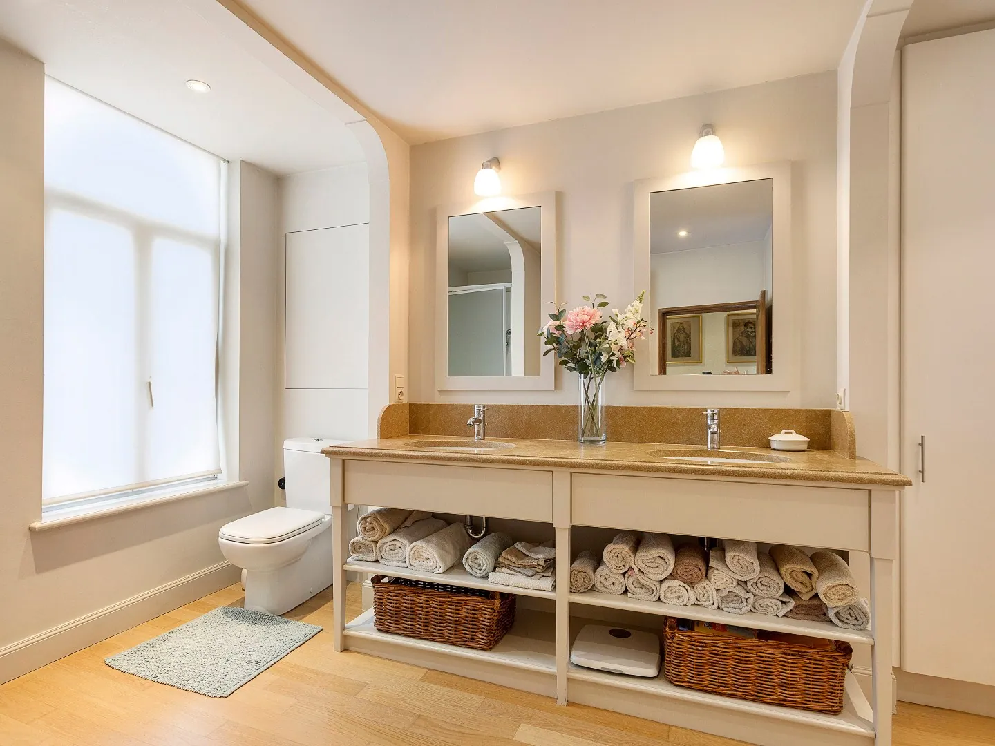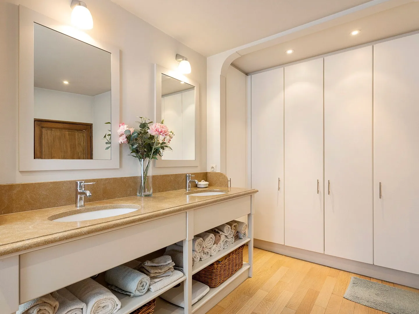 Op de eerste verdieping bevinden zich 4 slaapkamers. Verder is er ook nog een badkamer met douche, toilet, ingebouwde kasten & twee wastafels verwerkt in een meubel.