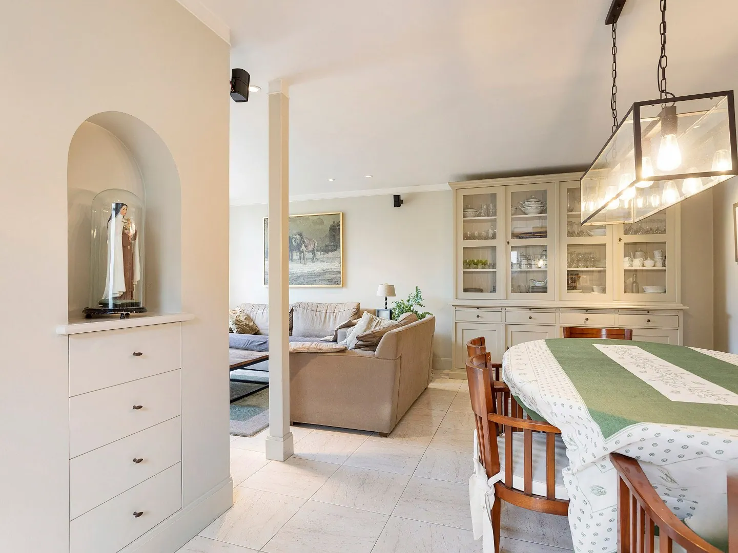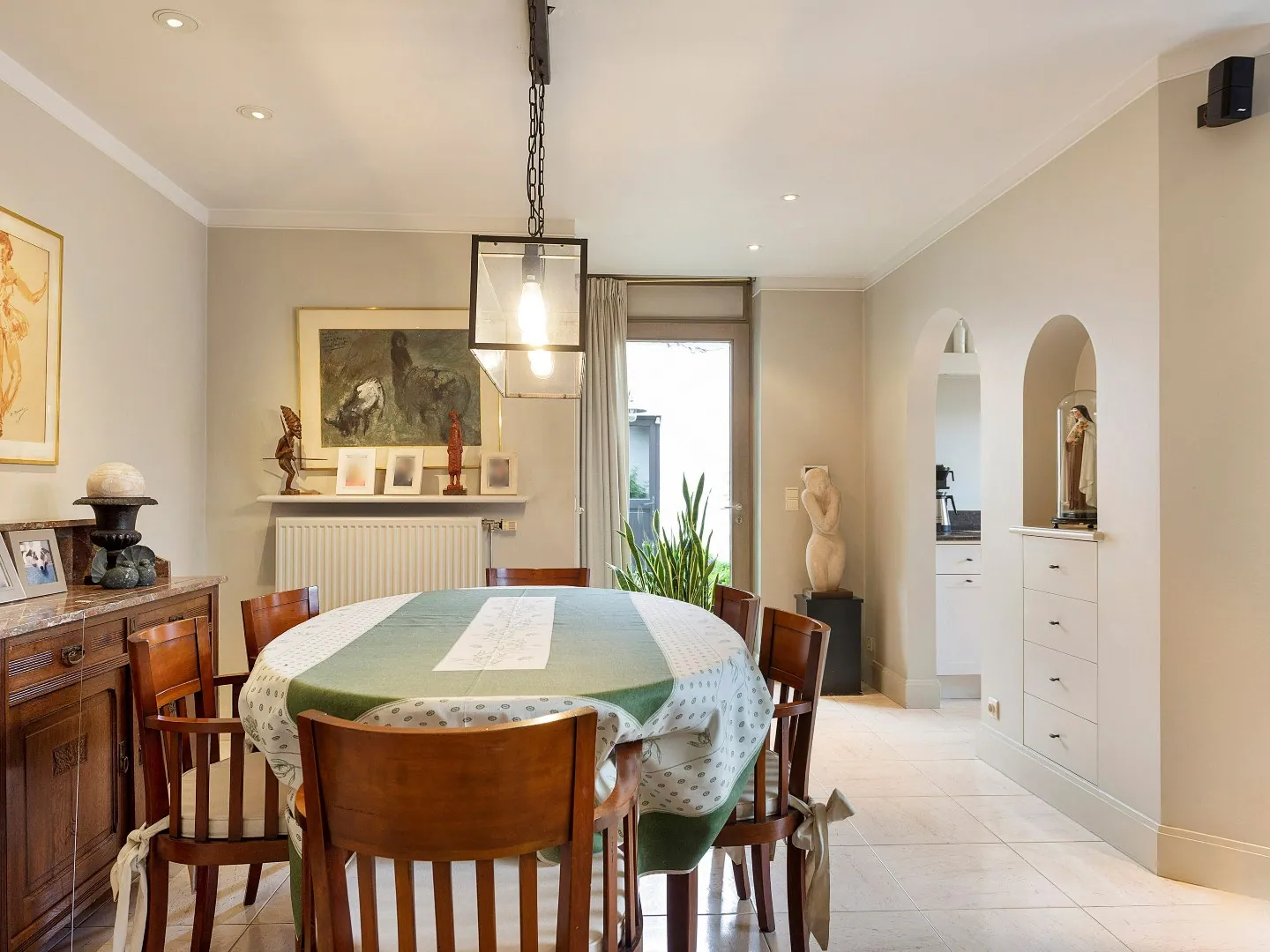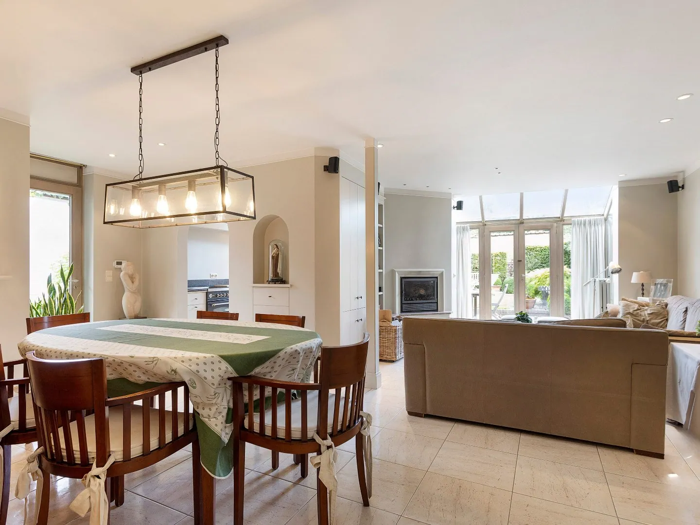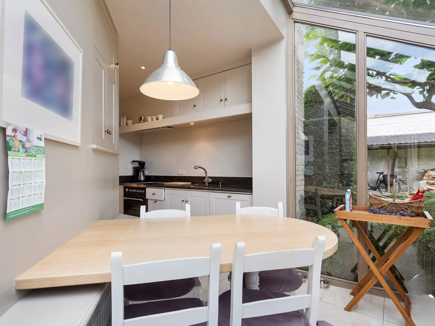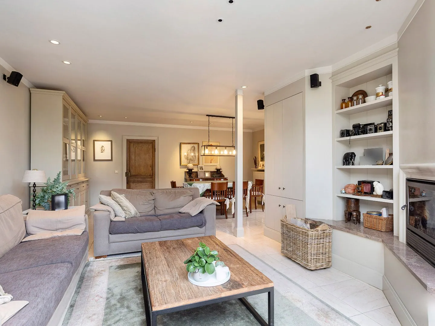Achterliggend vind je het prachtige en moderne woongedeelte terug. Op het gelijkvloers bevindt zich de lichtrijke woonkamer/eetkamer met een inbouwcassette waar het knus vertoeven is. Om de hoek vind je de gezellige keuken die tevens voorzien is van alle nodige toestellen. Ook via de keuken heb je toegang tot de tuin.