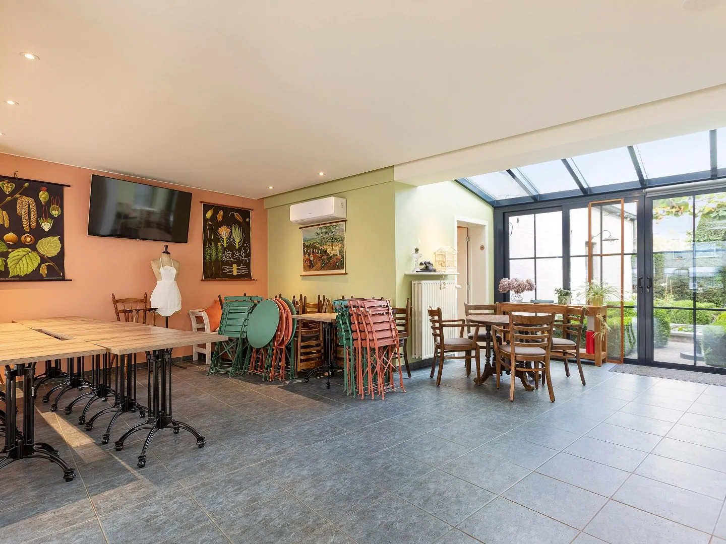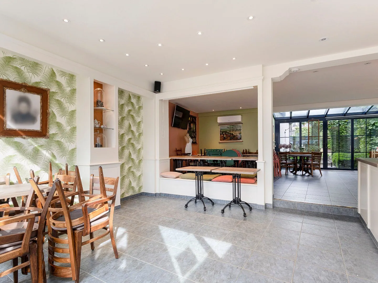 Op het gelijkvloers vind je de mooie horecazaak bestaande uit de handelsruimte (78m²) met bar, vestiaire, aparte toiletten voor dames en heren alsook een ruime berging (15m²) en plaats voor keuken/bureau (27m²). Vanuit de handelsruimte heb je rechtstreekse toegang tot de tuin waar je, omgeven van het groen, in volle privacy kan genieten van alle rust. De tuin is ook toegankelijk via aparte ingang langs de René D’Huyvetterstraat.