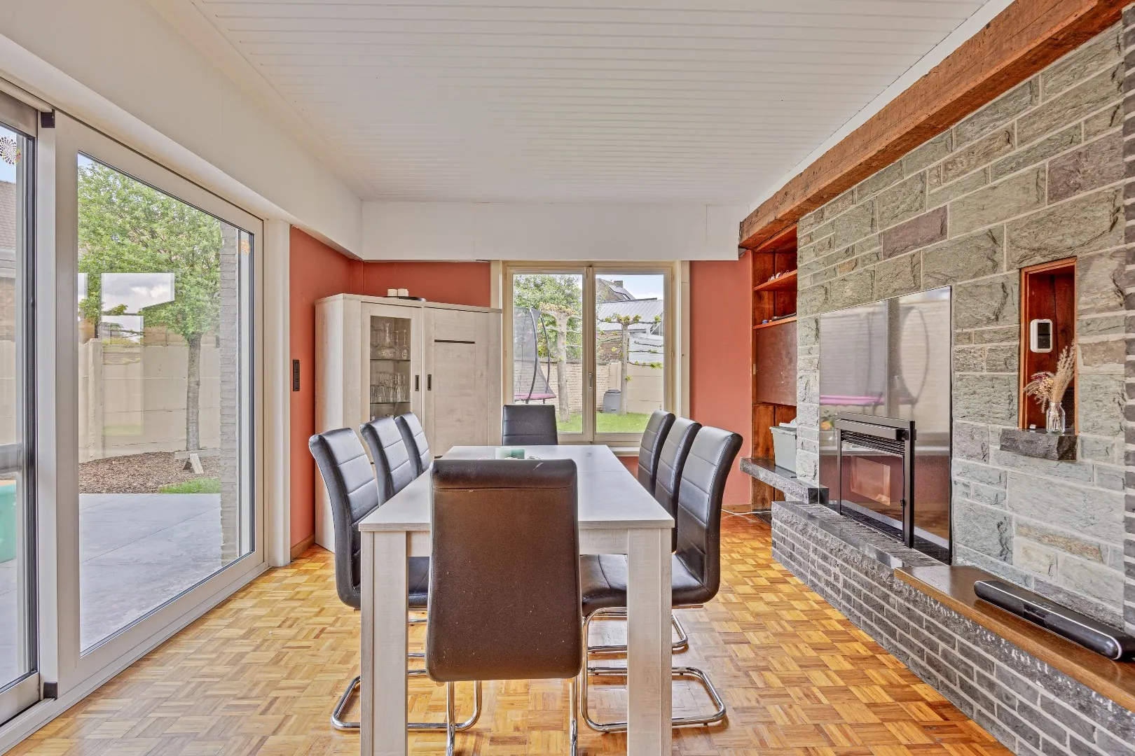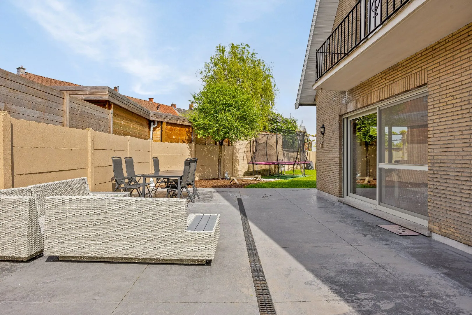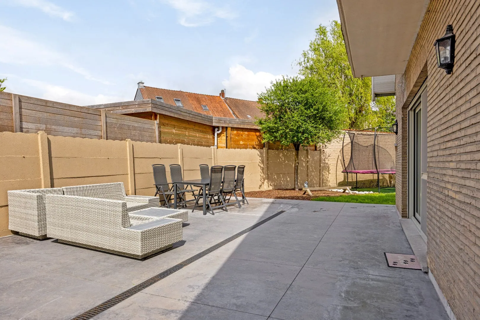 Bij binnenkomst betreed je de woning via de ruime inkomhal (10 m²). Van hieruit heb je gemakkelijk toegang tot het gastentoilet, de ruime garage (35 m²), een grote berging (11 m²), een bureauruimte die ook kan dienen als 5e slaapkamer (10 m²), de volledig uitgeruste keuken (26 m²) en de lichtrijke living (45 m²).