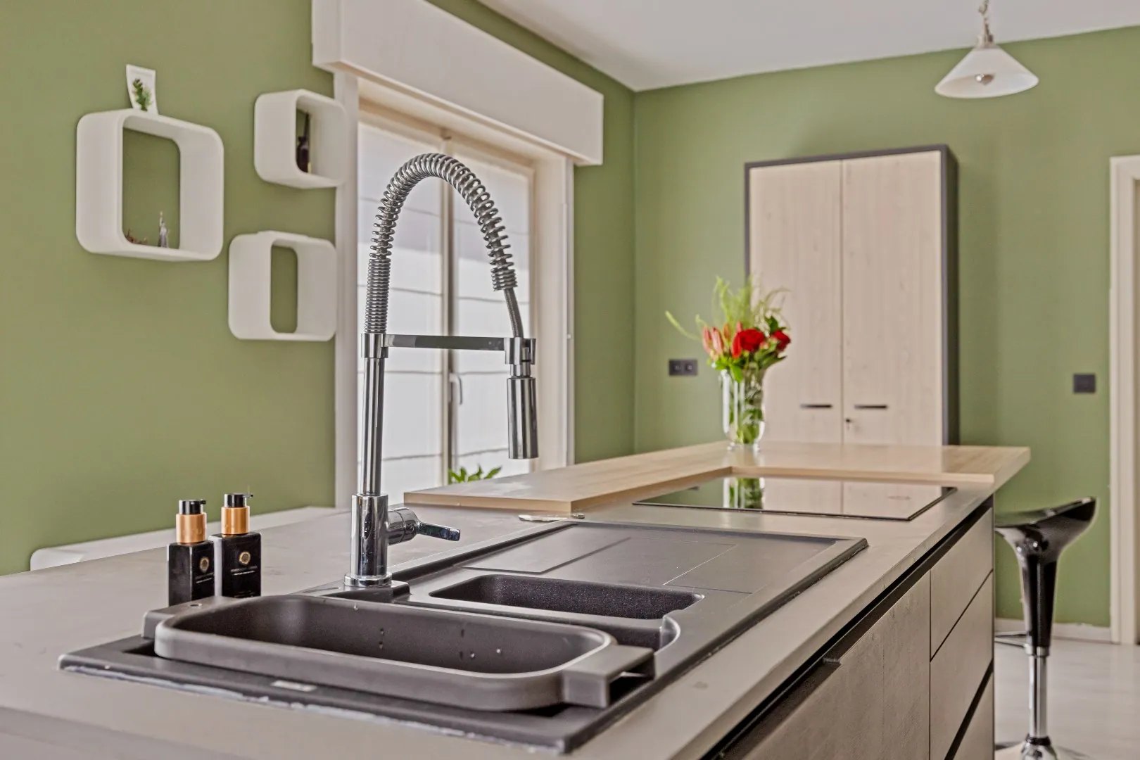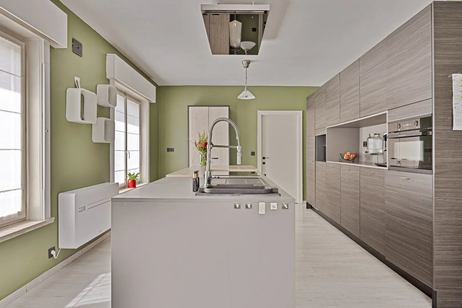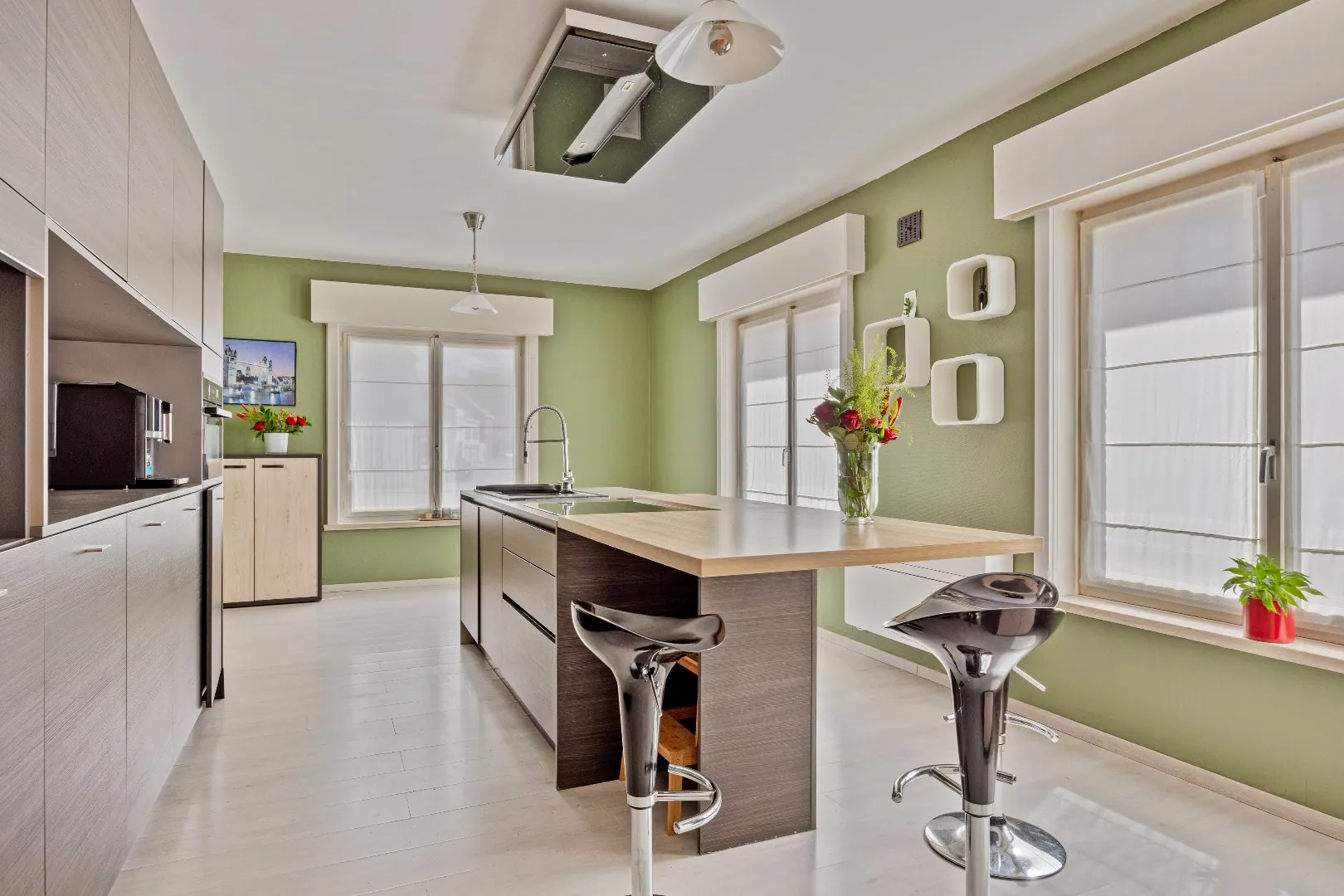 Bij binnenkomst betreed je de woning via de ruime inkomhal (10 m²). Van hieruit heb je gemakkelijk toegang tot het gastentoilet, de ruime garage (35 m²), een grote berging (11 m²), een bureauruimte die ook kan dienen als 5e slaapkamer (10 m²), de volledig uitgeruste keuken (26 m²) en de lichtrijke living (45 m²).