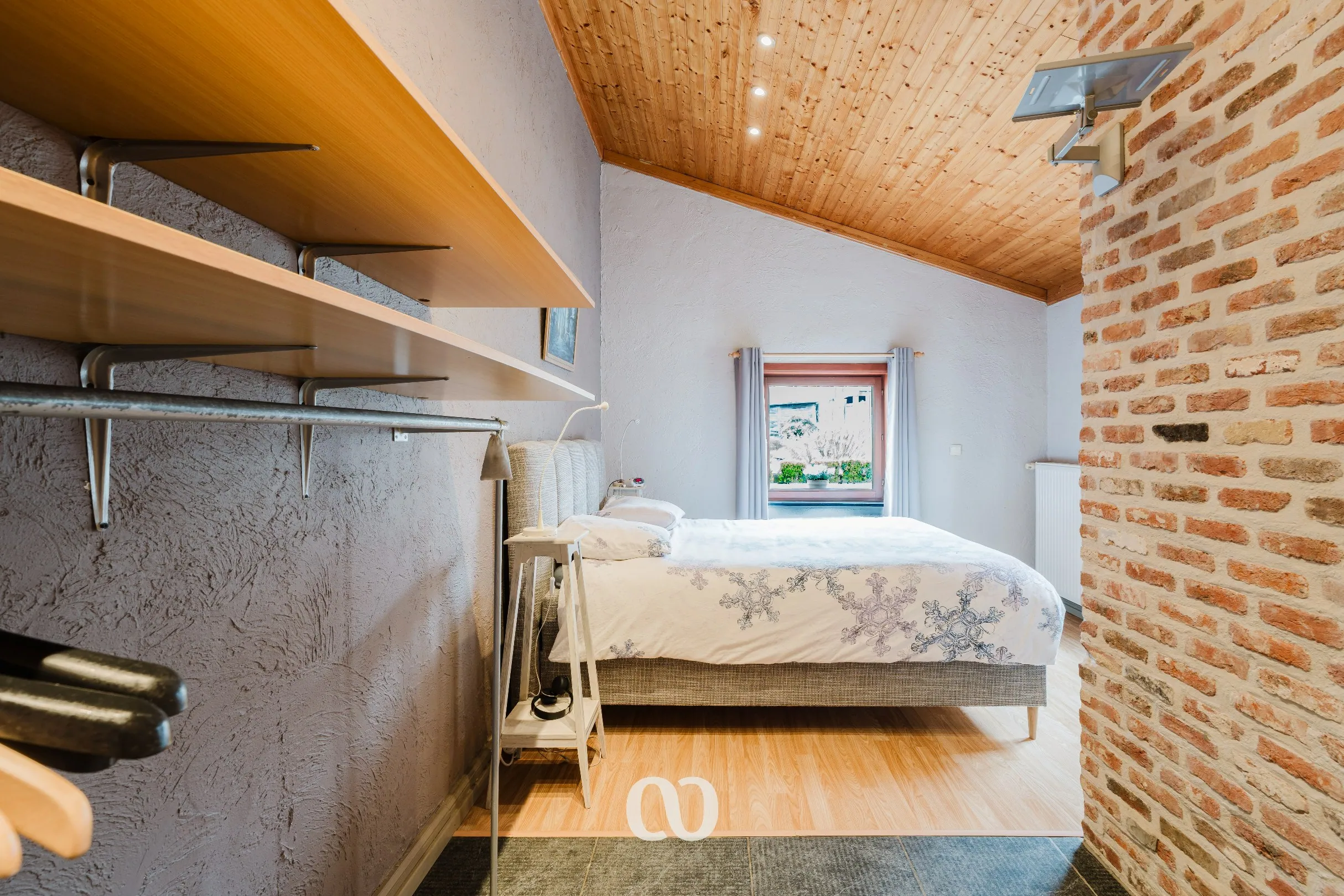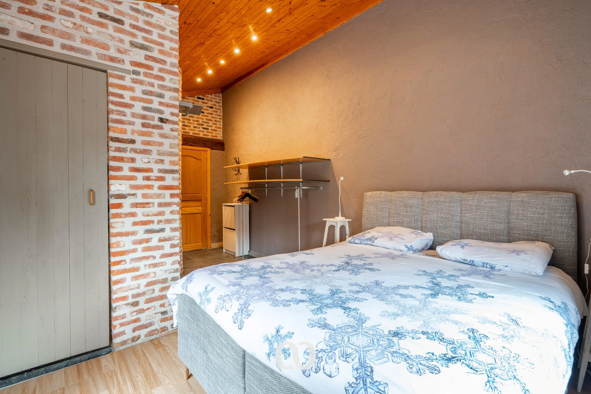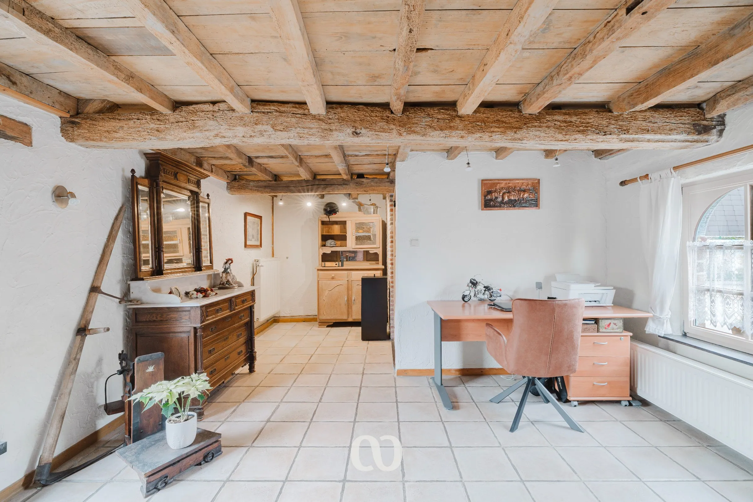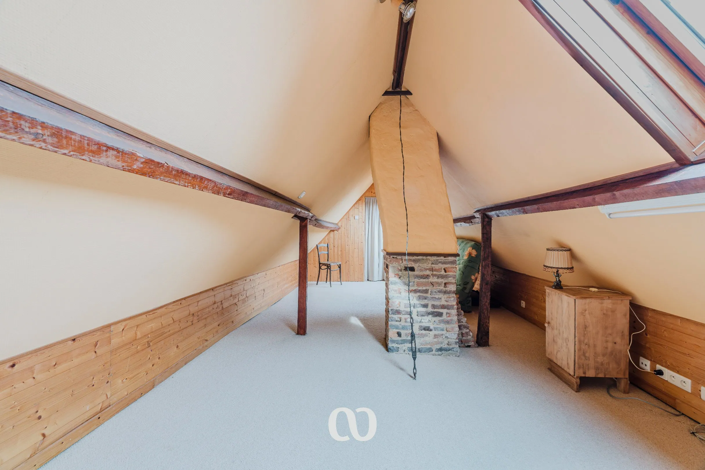 Op de eerste verdieping vind je een ruime kamer onder het dak. Deze ruimte kan perfect dienen als extra slaapkamer, bureau of hobbyruimte.