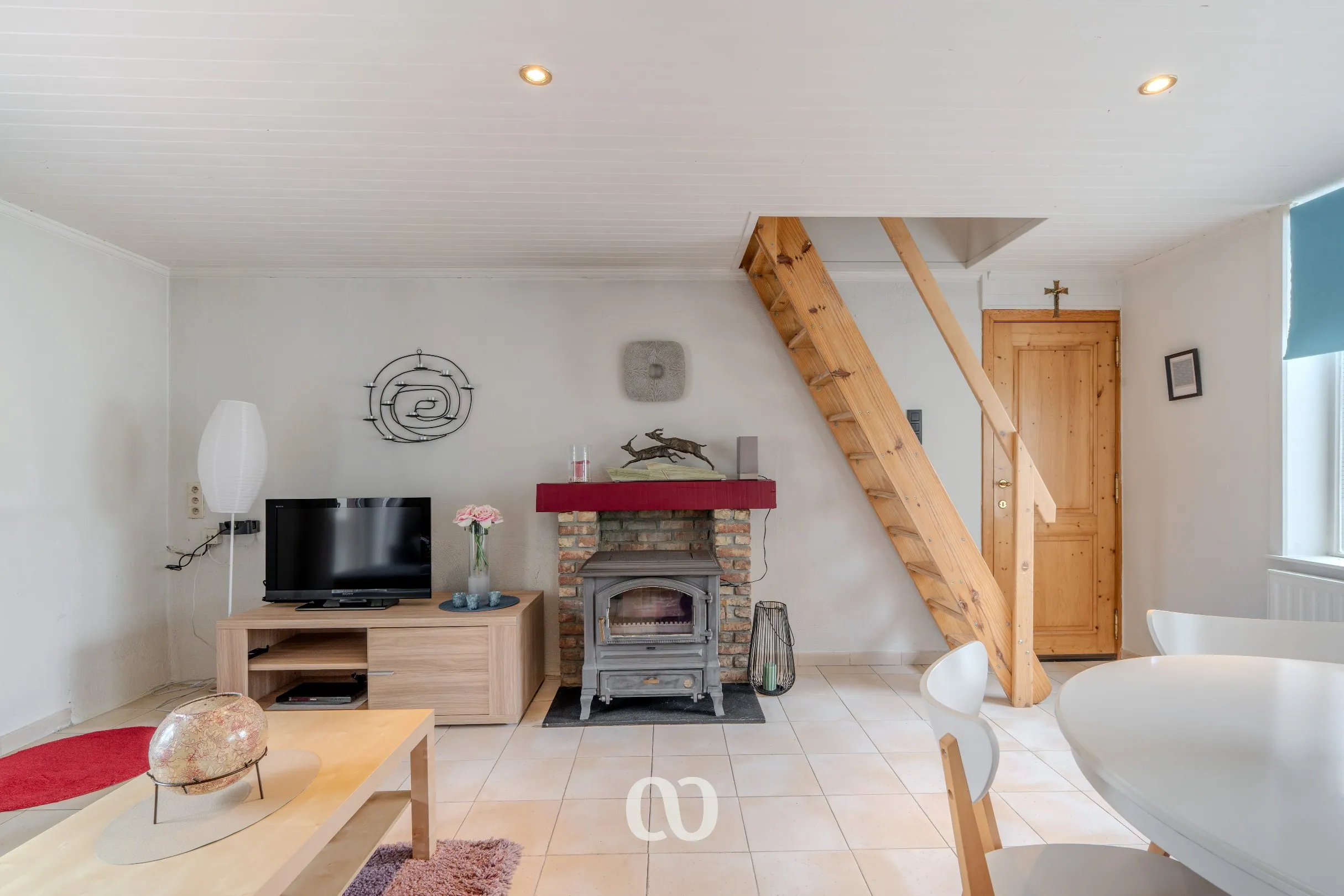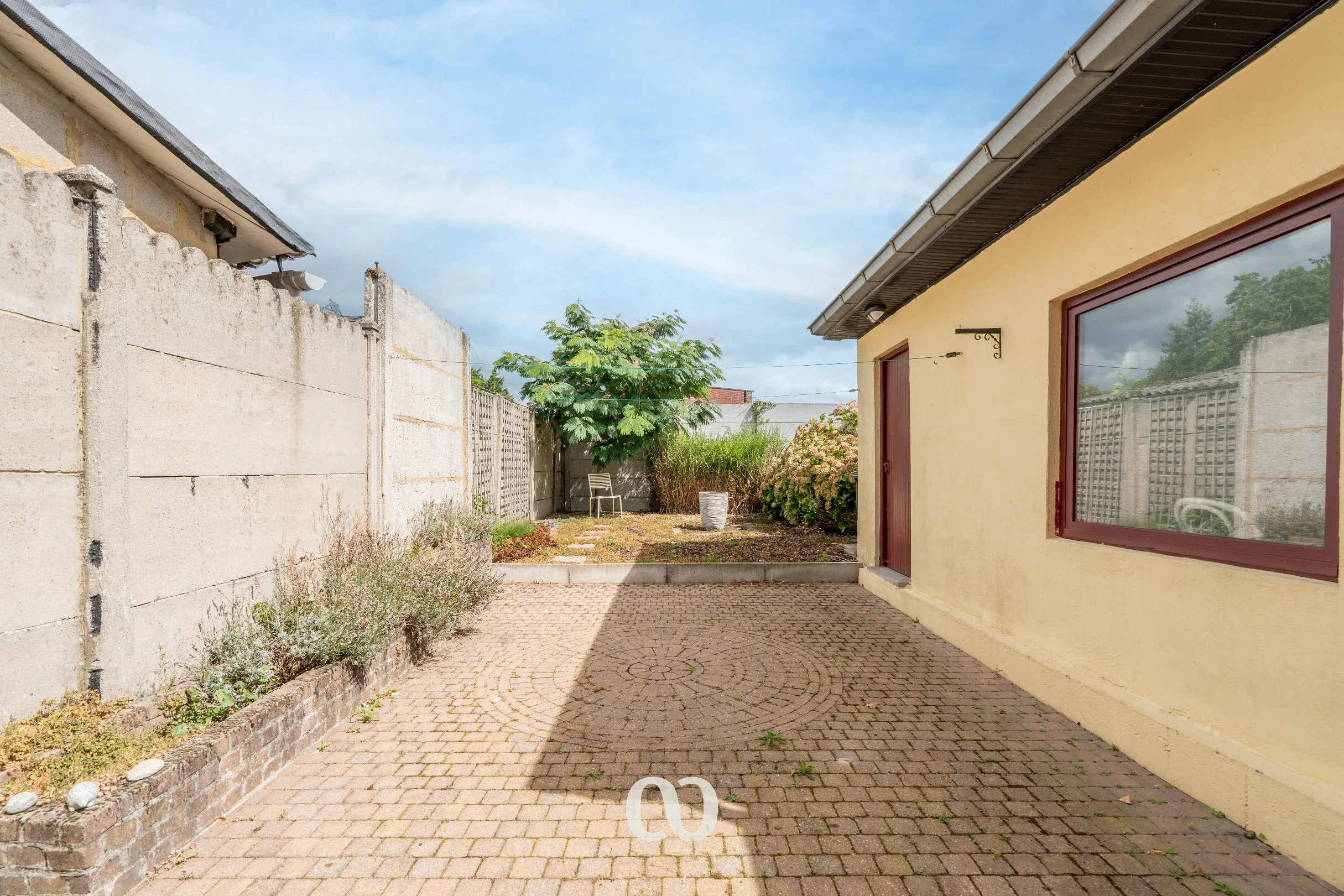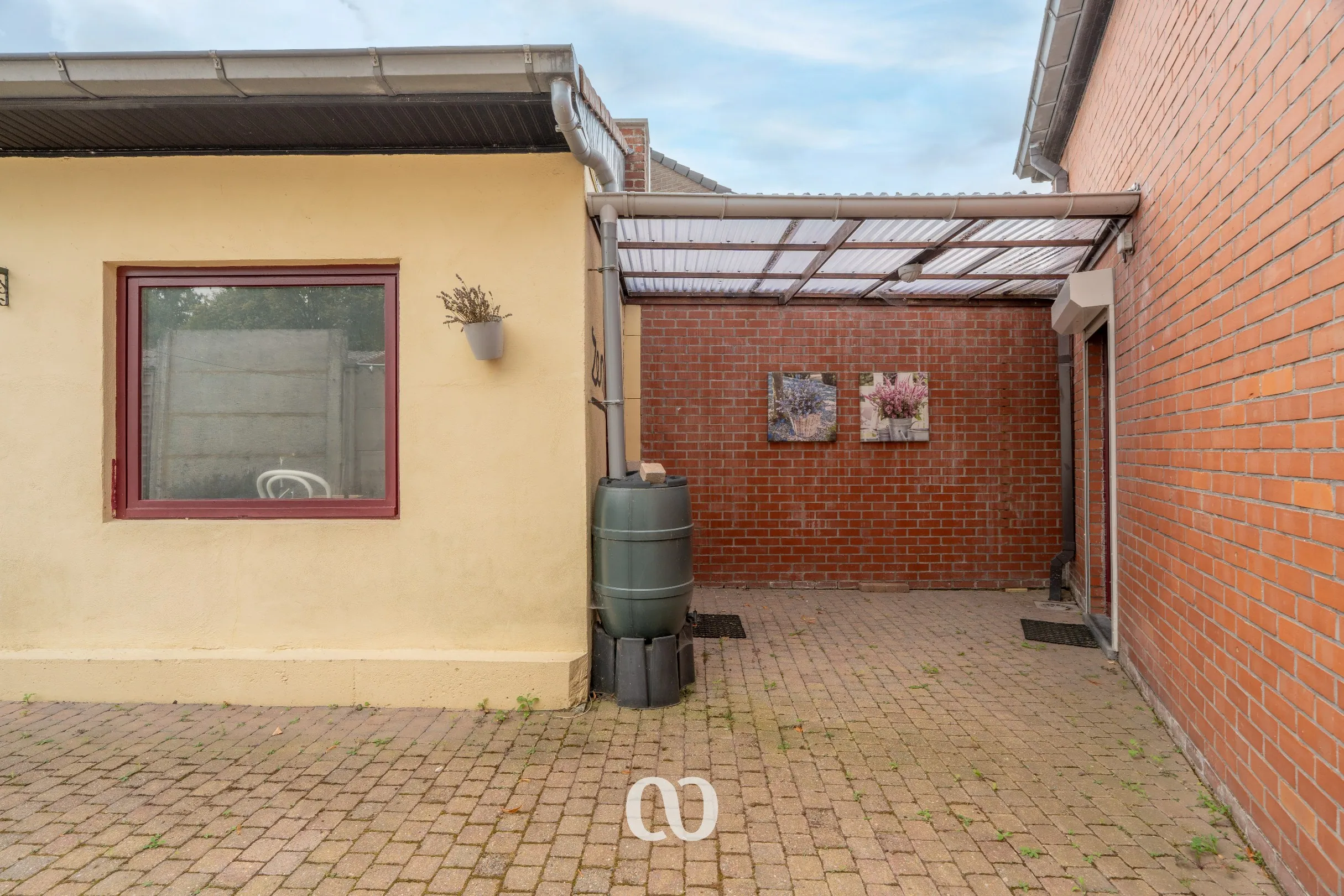 -GLV: Via de ruime inkomhal heb je toegang tot de volledig uitgeruste keuken, de leefruimte en de badkamer. Via het overdekte terras kan je het bijgebouw betreden dat momenteel gebruikt wordt als handige berging.