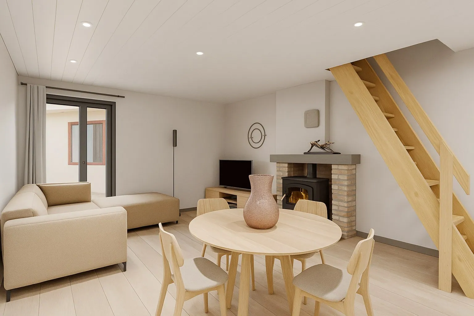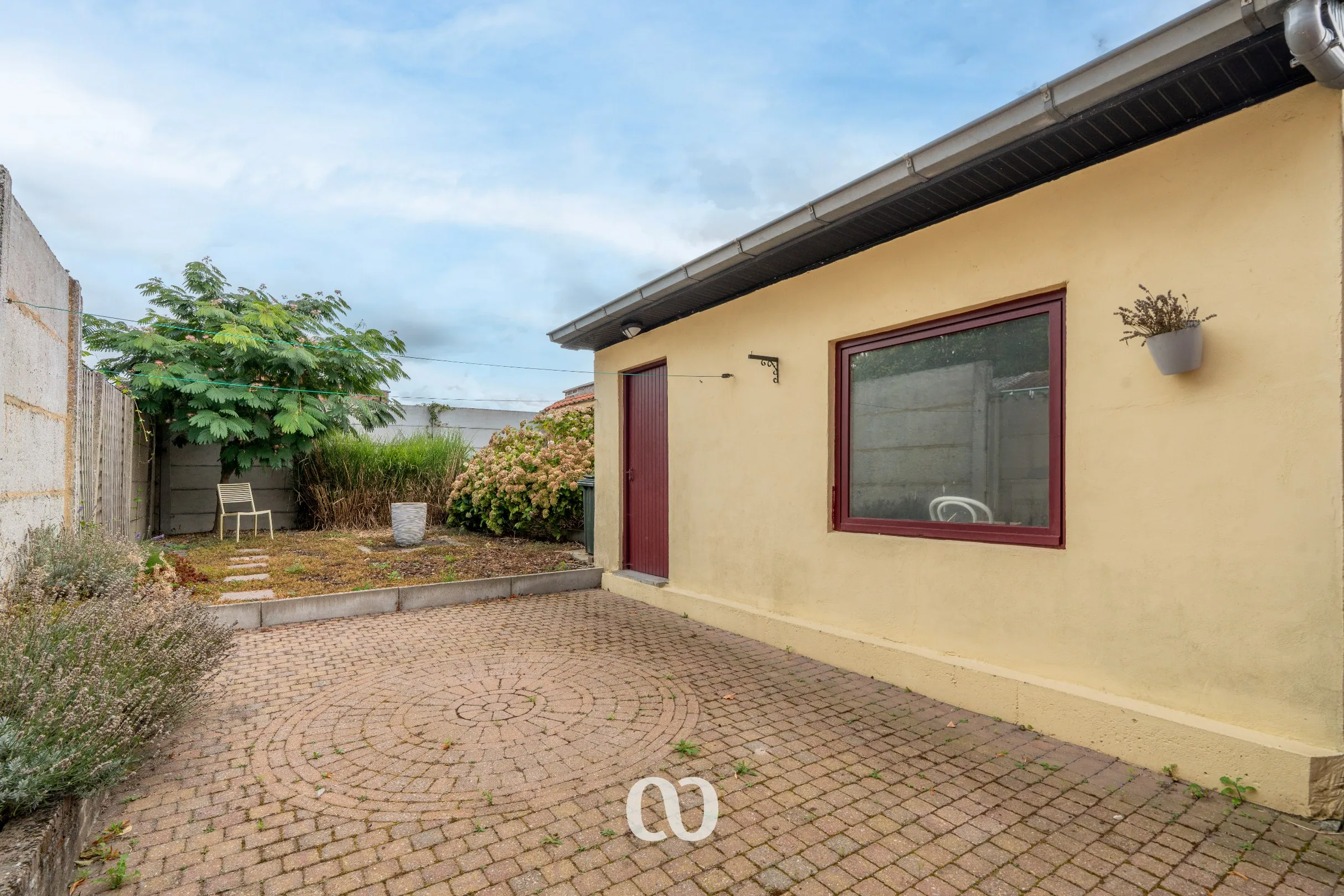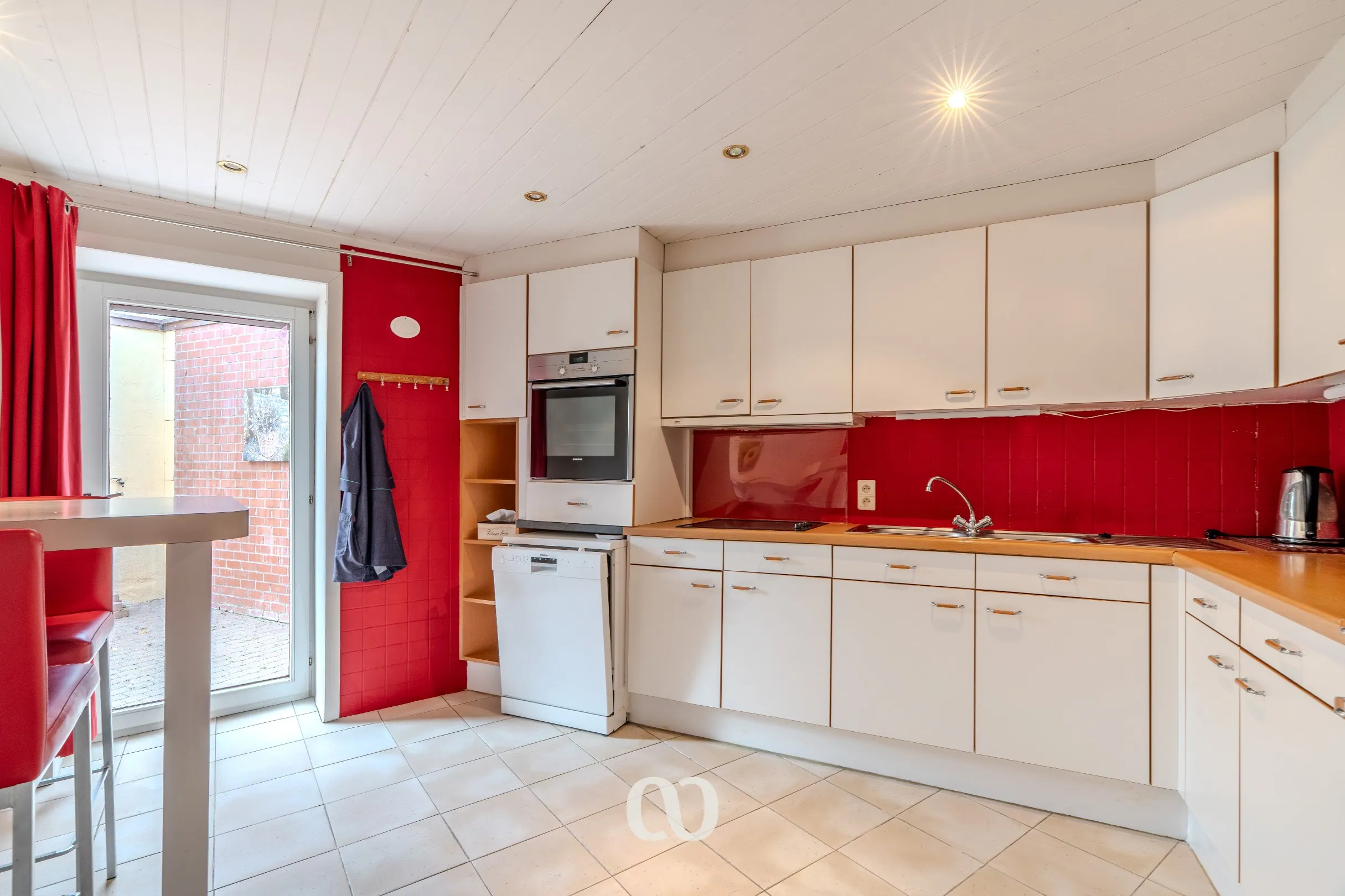 -GLV: Via de ruime inkomhal heb je toegang tot de volledig uitgeruste keuken, de leefruimte en de badkamer. Via het overdekte terras kan je het bijgebouw betreden dat momenteel gebruikt wordt als handige berging.